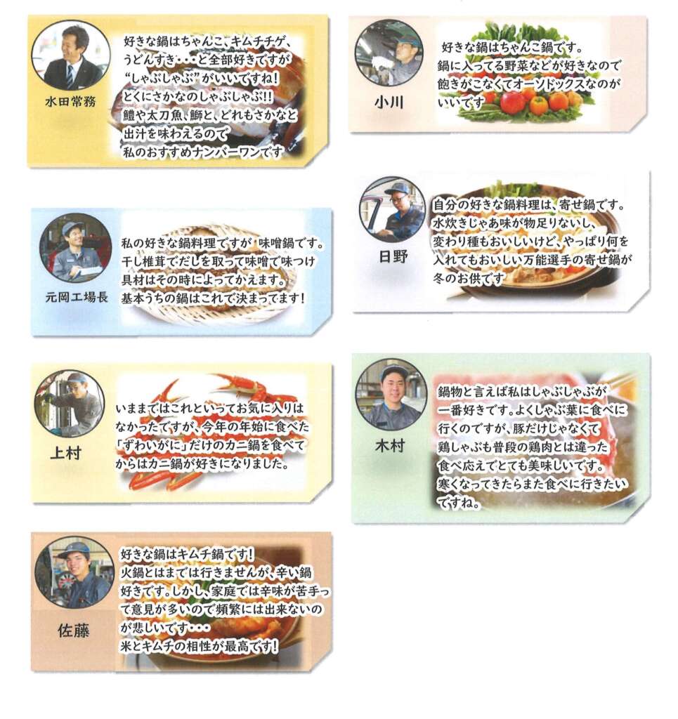 みなさんこんにちは!まだ暑い日が続いておりますが、あっという間に寒い時期がやってくるかとおもいます…寒い時期といえばお鍋!ということでサービススタッフの皆さんに好きなお鍋を聞いてみました!