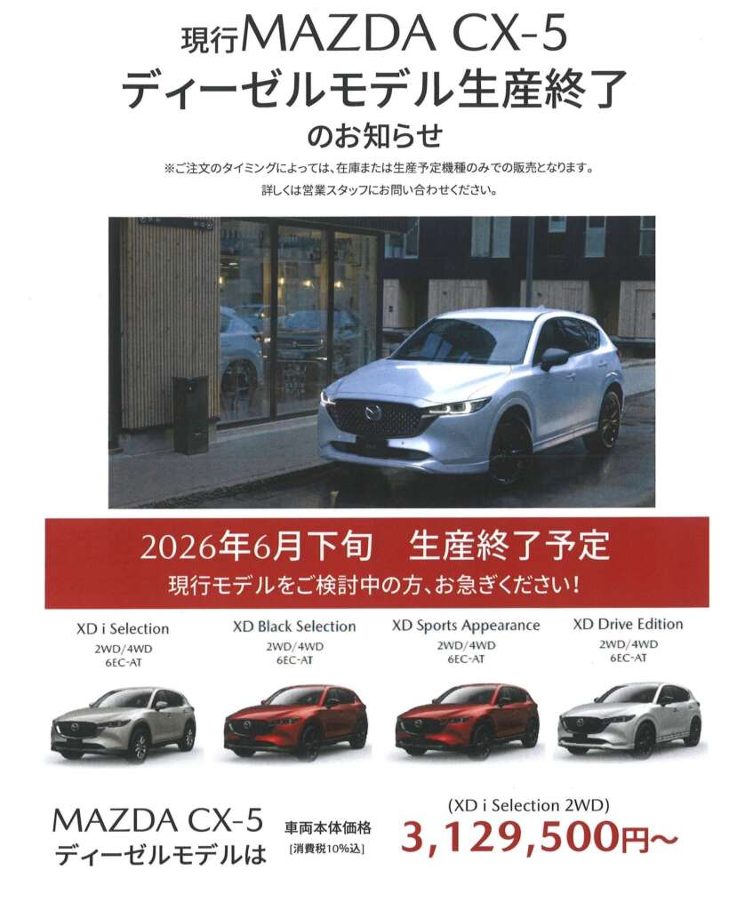 今回は現行MAZDA CX-5 ディーゼルモデル生産終了のお知らせです。